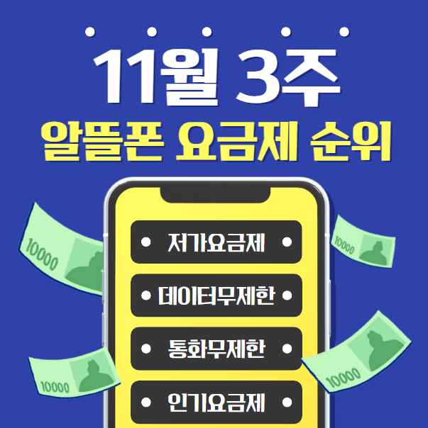 이상으로 11월 현재 기준 알뜰폰 요금제에 대해 알아보았습니다. 이번주는 지난주에 비해서 큰 차이는 없는 것으로 보이는데.. 프로모션이 많은 알뜰폰 요금제 특성상 정책변경, 조기마감 등으로 포스팅 시점과 일부 내용이 상이할 수 있는 점은 양해 부탁드립니다.